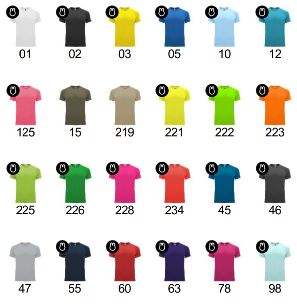 Amarillo, Amarillo Fluor, Arena Oscuro, Azul Luz de Luna, Blanco, Celeste, Coral Fluor, Gris, Lima, Marino, Morado, Naranja Fluor, Negro, Plomo Oscuro, Rojo, Rosa Fluor, Rosa Lady Flour, Roseton, Royal, Turquesa, Verde Fluor, Verde Helecho, Verde Menta, Verde Militar